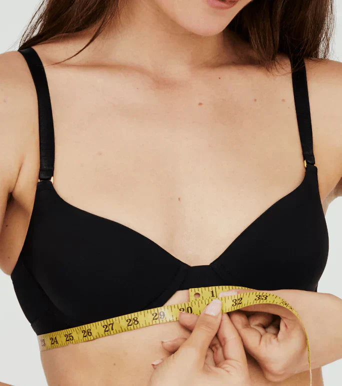 Before you start, put on a lightly lined bra — no push-ups or compression sports bras — and grab a soft measuring tape. If you don’t have a measuring tape, it’s no big deal. A string and a ruler work too.